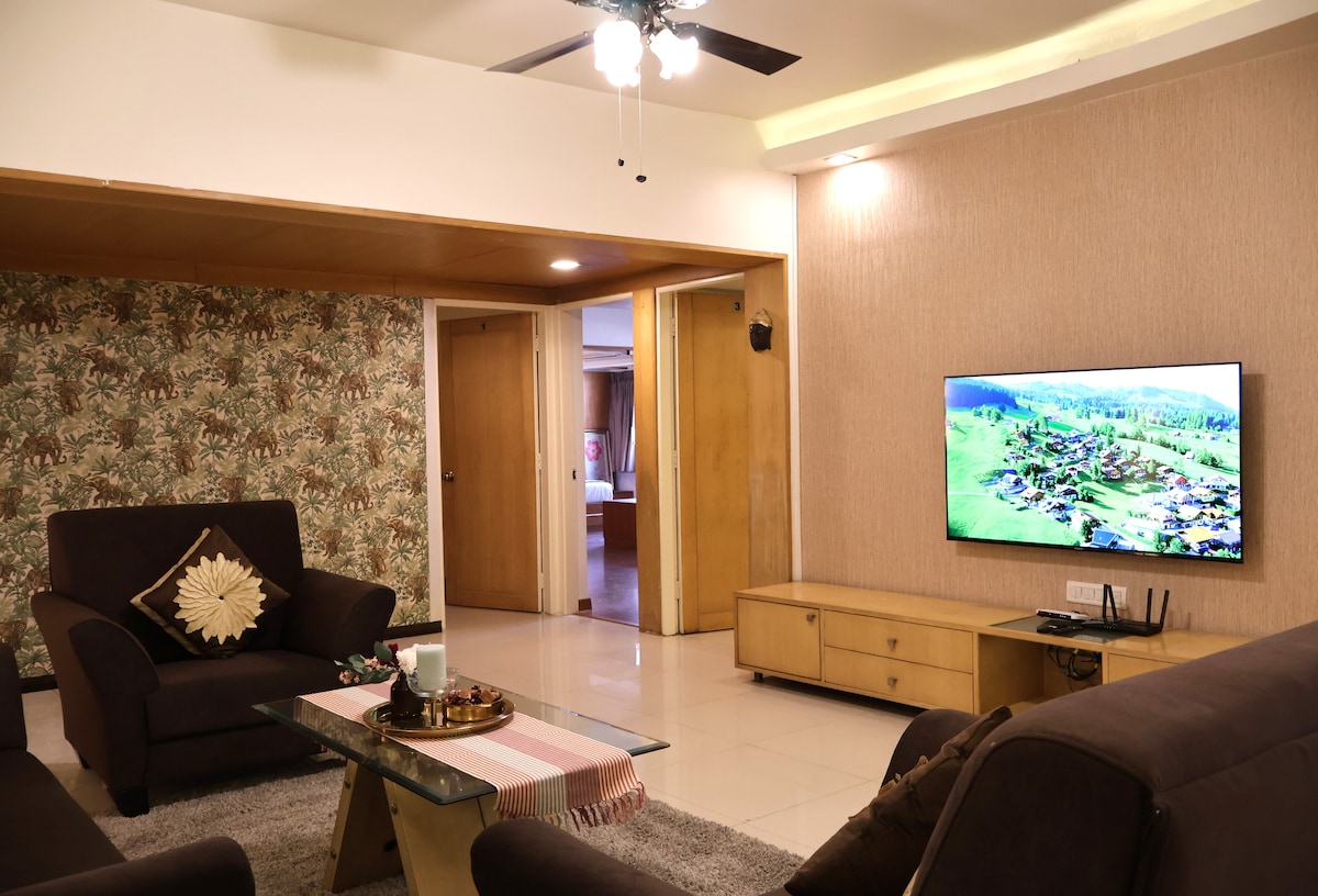Experience our brand new, luxury 1-BHK apartment, ideal for couples and travellers seeking comfort and privacy in a central location. The bedroom has a king bed with soft orthopedic mattress for a restful night's sleep. Relax in the cozy living room with a 43-inch Smart TV, lightning-fast WiFi and a dedicated dining area. Comes with a super clean bathroom stocked with bath essentials. The fully equipped kitchen includes high-quality appliances and crockery for your culinary adventures!