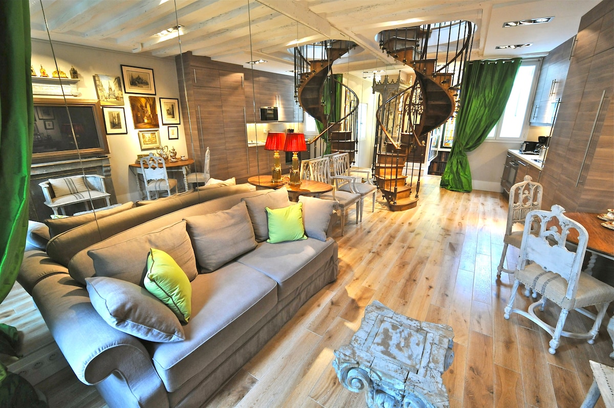 Bienvenue dans notre duplex sous les toits, climatisé, avec une vue imprenable sur Notre Dame et la Seine ! Il faut monter 3 étages à pied mais le balcon sur lequel vous prendrez votre petit déjeuner en admirant la cathédrale sera votre récompense ! Entièrement équipé et meublé d'antiquités, notre appartement logera 4 invités avec un lit queen size et un canapé convertible très comfortable. Nous sommes très disponibles pour faire que votre séjour reste inoubliable !
