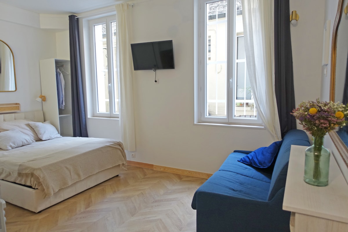 Welcome to our one-bedroom haven, meticulously designed with taste. Enjoy the calm of the courtyard and its small terrace, while in the middle of a lively district. The space emanates a warm, home-like essence. Situated in the heart of the trendy dining and café scene, on the banks of the canal Saint Martin, it's also a few blocks away from the historic charm of Le Marais district.
