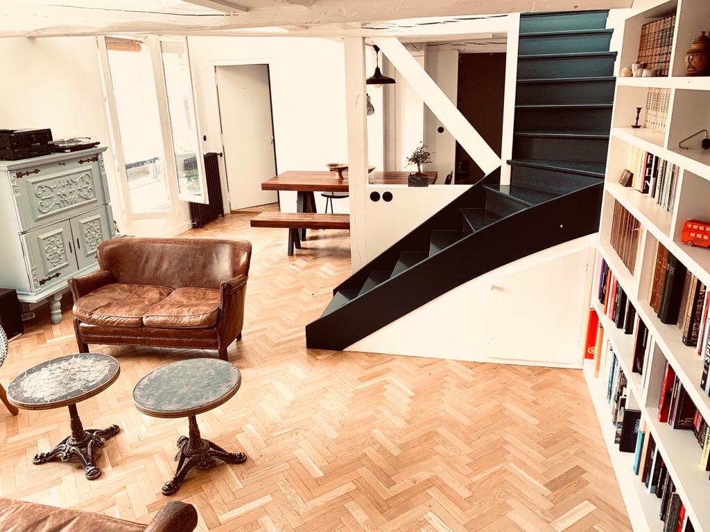 Profitez d'un logement élégant et central, proche de la Place de la Bastille et son marché, de la place des Vosges et du Marais. L'appartement design et lumineux est composé d'un premier espace ouvert avec cuisine, salon et salle à manger donnant par deux grandes porte-fênetres sur le balcon plein sud de 8m2. Un escalier donne accès à une haute mezzanine de 20m2 logeant le dressing et la chambre avec son lit de 160cm. La salle de bain blanche offre douche, toilettes et sèche-serviette.