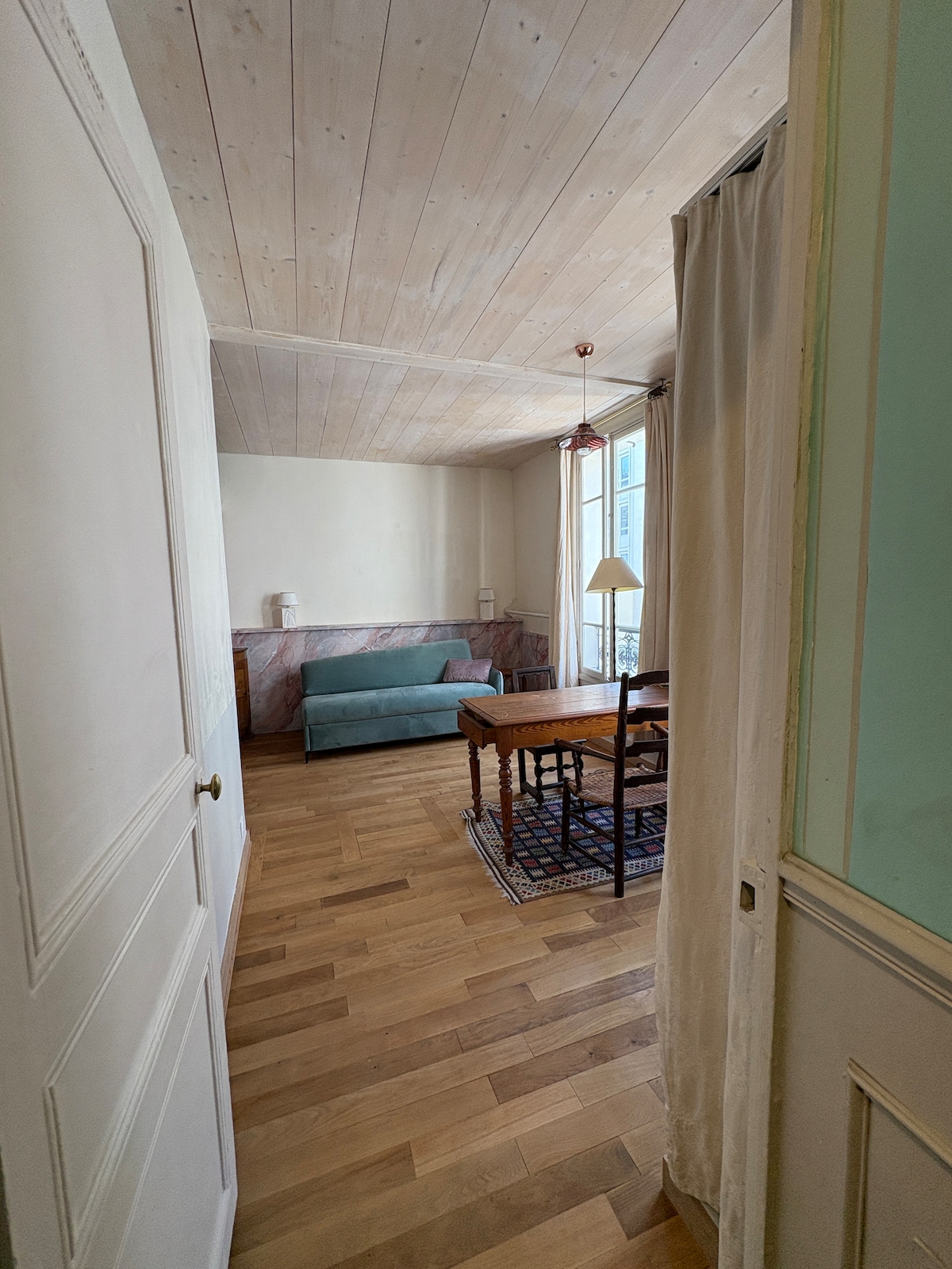 A cozy and calm shelter at Le Marais, 200m from Place de Vosges, in a 2021 renovated 1870's building with an authentic mood, original features, plus modern confort in a minimal deco. A 2nd floor by elevator giving to a quiet courtyard, it has a living room, open kitchen, bedroom and bathroom. High Speed Internet. Netflix. Walk to: Subway 3’~P.des Voges 3’ ~M.Picasso 8’~Seine's bank 13’ Pompidou's museum 18’ ~N.Dame 21’ ~C. S.Martin 23’ ~Pinault Collection 29’~Louvre 33’ S.Germain 35’