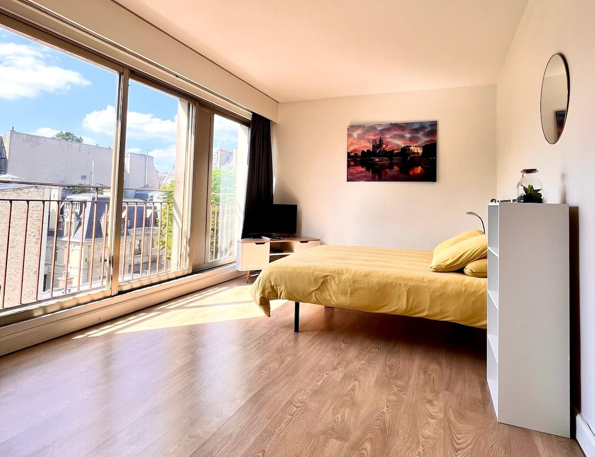 Fully renovated and refurbished studio with the most amazing view of the Eiffel Tower and most Parisian monuments. Wake up to the breathtaking sight of the Eiffel Tower right from your queen-size bed. The large French windows and the balcony make the experience even more memorable. The studio is located 10 min walk from the Eiffel Tower and 4 min walk from Metro stations. The building is safe, and there are plenty of shops and restaurants in the neighborhood. A/C, High Speed broadband, Netflix