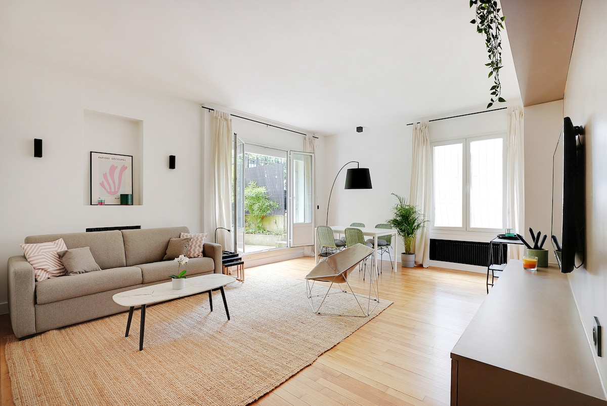 Quiet and located just steps from the Eiffel Tower, the Seine River, and the Quai Branly Museum in a safe and lively neighborhood with museums, restaurants, and theaters. 80 sq m apartment with a bright living room, large bedroom, fully equipped kitchen. High ceilings. Living room : a daybed and a sofa bed provide additional sleeping options. Both are very comfortable. Carefully decorated in a contemporary style, creating an elegant and calming atmosphere. Professional cleaning guaranteed.