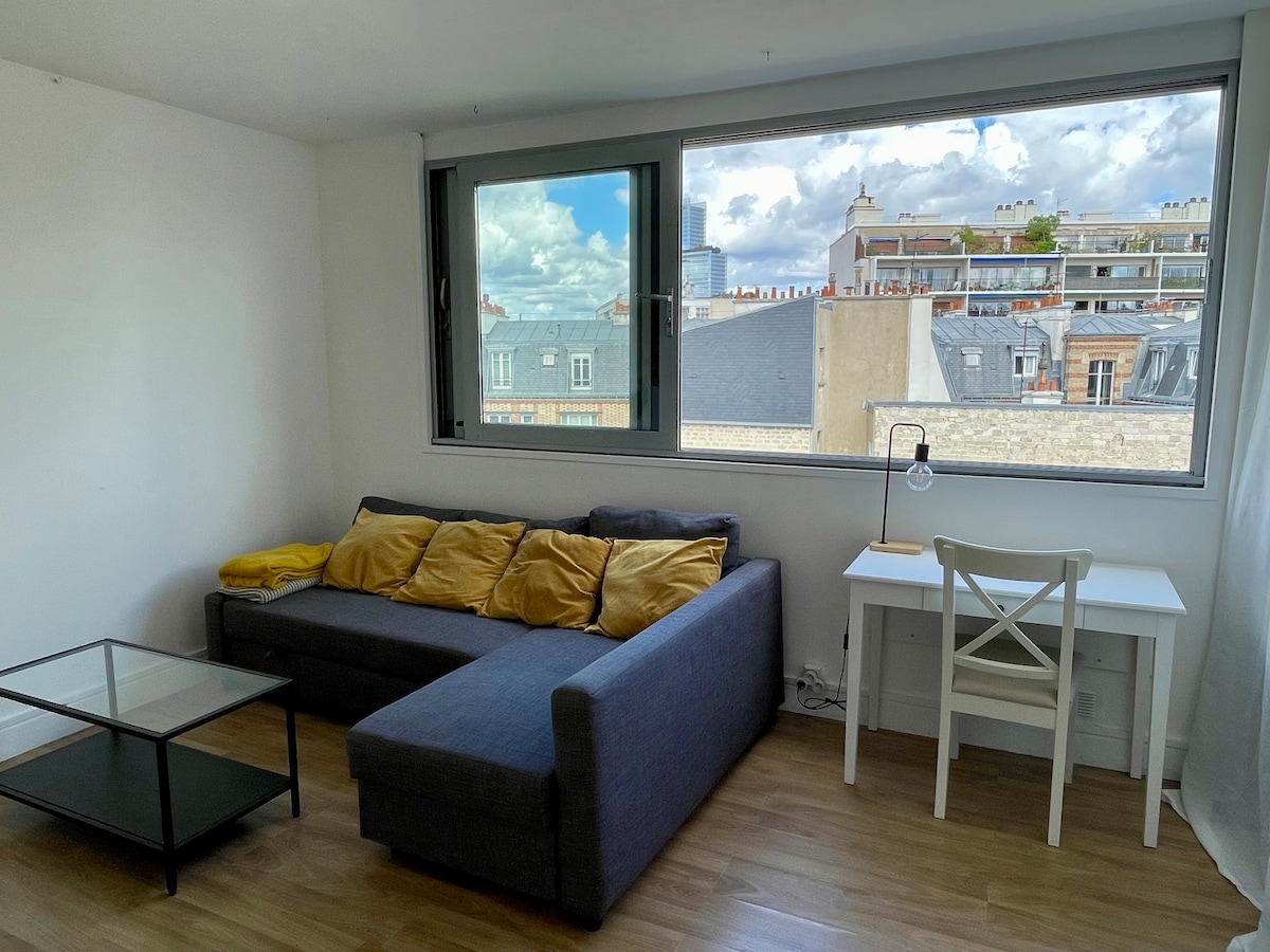 Notre studio de 15 m2 vous accueille dans un bel immeuble haussmannien du 17e arr. Vous l'apprécierez pour son côté cosy, sa luminosité, le petit balcon avec vue spectaculaire. Le studio est au 7e étage Sans ascenseur. Nous vous prions à prévoir des valises appropriées. Transports, commerces, parcs à proximité. L'Arc du Triomphe, Champs Elysées à 15 -20 min à pied/ métro. Kitchenette équipée, séjour avec canapé-lit (couchage rapide), salle d’eau et WC (lavabo, douche et toilettes).