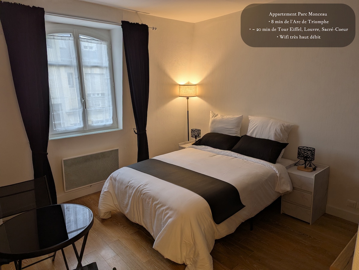 Appartement fraichement rénové donnant sur cour calme dans un bel immeuble Haussmannien. Entièrement meublé : chambre, cuisine, salle de bain, ainsi que le wifi haut débit. Situé entre les très chics 8e et 17e arrondissements, métro Courcelles (ligne 2) ou Malesherbes (ligne 3), et proche des principaux sites touristiques (8 min de l'Arc de Triomphe, 20 min des Champs Élysées, Tour Eiffel, Sacré-Coeur, Louvre). 6e étage, sans ascenseur 💪
