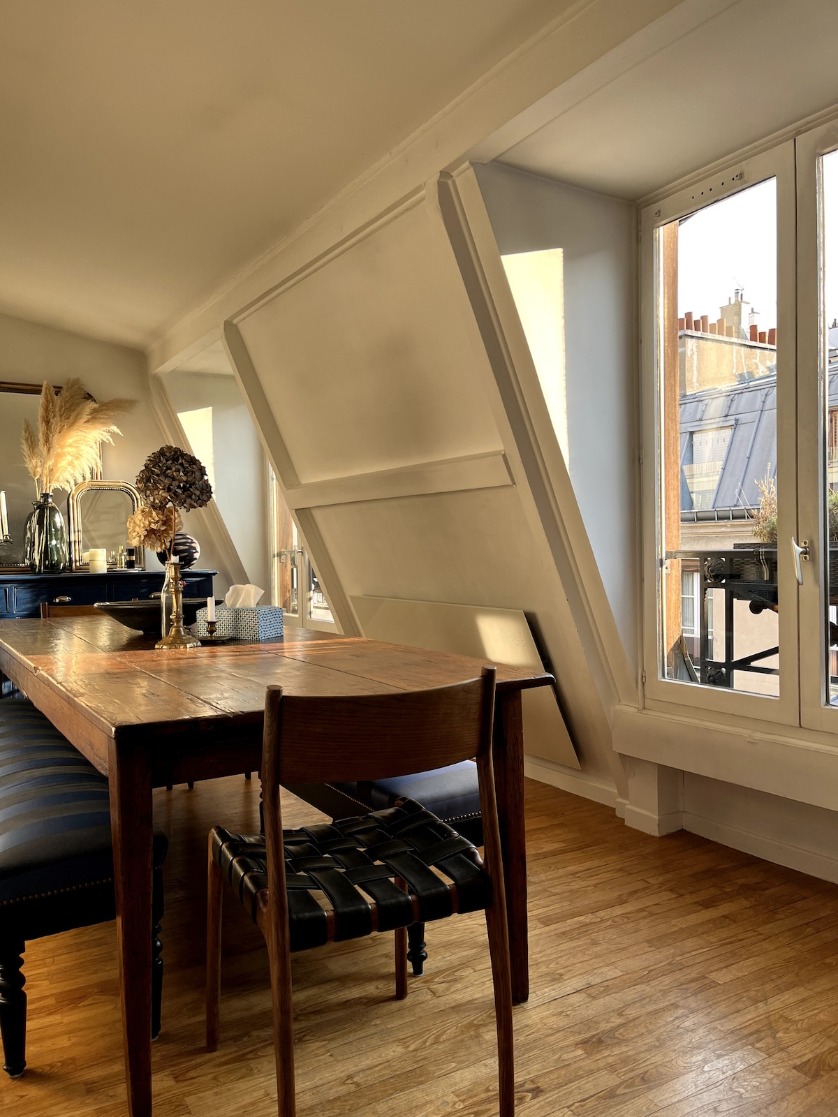 New apartment totally renewed by an architect, a lot of light, under the roof with the top of the Eiffel Tower view! In the heart of Batignolles and Montmartre district, at 10min walking distance from the Sacré Cœur, at 10min walking distance from Moulin Rouge and the very dynamic district Pigalle, at 20min walking distance from Madeleine/ Concorde... On the 5th floor without elevator but a great space, light and view when you re in the apartment! It worths it!