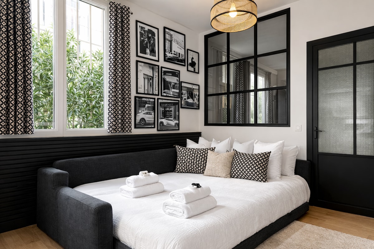 Discover our unique and luxurious apartment, fully renovated by an architect, air-conditioned, and spread over two levels, just steps away from the Eiffel Tower and École Militaire metro station. You'll find a bedroom with TV, a queen-size bed, a desk/console with a dressing area, and a double sink for optimal comfort. The living room features a sofa bed with a high-quality mattress. Located near the famous Rue Cler, this gem combines comfort and style for an unforgettable experience in Paris.