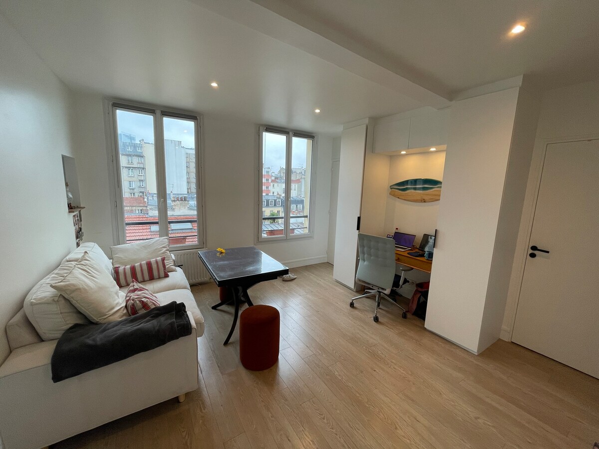 Ce studio aménagé avec goût dans l’esprit d’une suite d’hôtel, vous fera vivre une expérience exceptionnelle au cœur du Paris des artistes. Située au 7ème et dernier étage d’un immeuble en pierre de taille (ascenseur jusqu'au 6ème), ses 35 m2 offrent un niveau de confort digne d'un hôtel 4* : lit Queen Size, douche XXL, Hifi, calme... Le petit plus pour rendre votre séjour inoubliable : la vue panoramique offerte sur les toits et la Tour Eiffel depuis les deux grands Vélux du salon !
