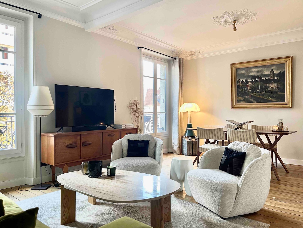 Beautifully curated 53 sqm one-bedroom flat on the 4th floor (with lift) of an Haussmanian building at the foot of Montmartre Hill (Guy Môquet L13 & Lamarck-Caulaincourt L12). The apartment is spacious, light-flooded, well appointed and thoughtfully decorated. Only a stone's throw away from the Abbesses, Sacré Coeur, place du Tertre, but also Pigalle’s buzzing nightlife and Moulin Rouge, it is ideally located to explore Montmartre and an easy metro commute to the centre of Paris and left bank.