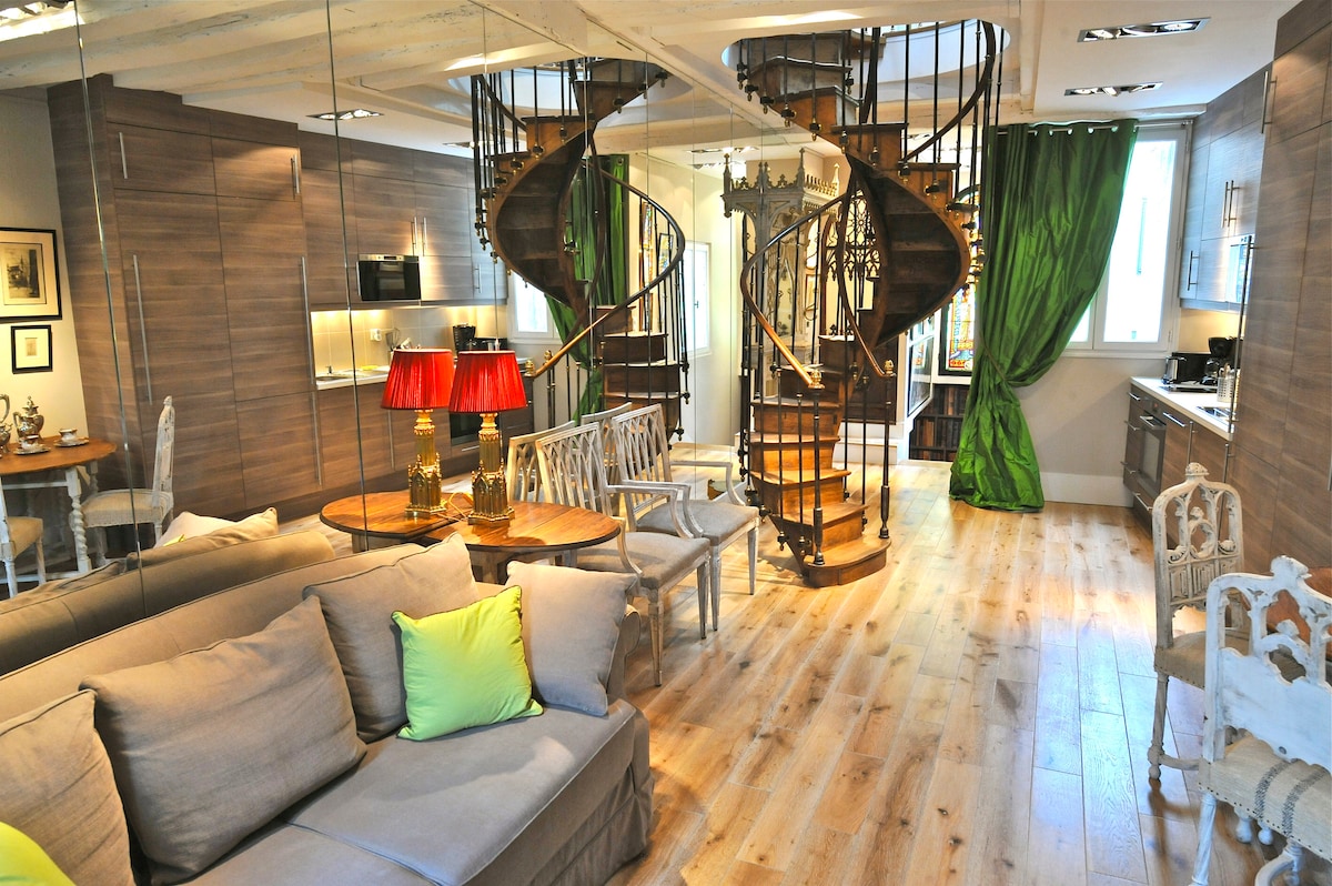 Bienvenue dans notre duplex sous les toits, climatisé, avec une vue imprenable sur Notre Dame et la Seine ! Il faut monter 3 étages à pied mais le balcon sur lequel vous prendrez votre petit déjeuner en admirant la cathédrale sera votre récompense ! Entièrement équipé et meublé d'antiquités, notre appartement logera 4 invités avec un lit queen size et un canapé convertible très comfortable. Nous sommes très disponibles pour faire que votre séjour reste inoubliable !