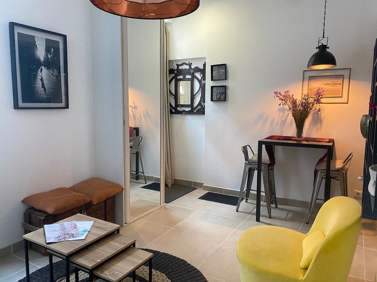 Welcome to our one-bedroom haven, meticulously designed with taste. Enjoy the calm of the courtyard and its small terrace, while in the middle of a lively district. The space emanates a warm, home-like essence. Situated in the heart of the trendy dining and café scene, on the banks of the canal Saint Martin, it's also a few blocks away from the historic charm of Le Marais district.