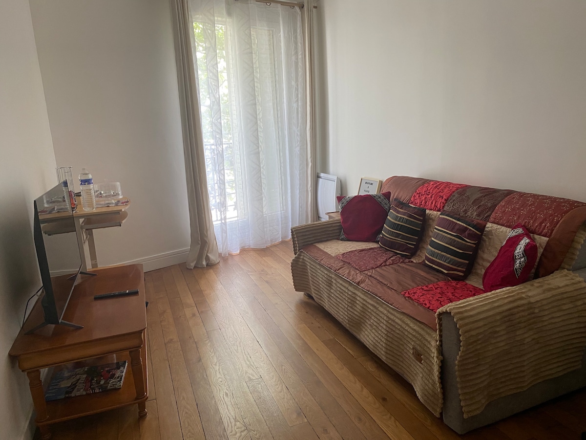 À Paris .Très belle appartement de 50 M2, type F2/F3, proche de toute commodité. Métro 2 minutes à pieds. Très bien agencé, tout équipé. 2 eme étage avec ascenseur l’entrée donne sur une double séjour ( salon constitué d’un canapé convertible deux places - salle à manger fonctionnelle avec un grand meuble de rangement) Une cuisine équipée salle de bain, toilettes séparés Une chambre à coucher avec un grand lit queen. Appartement paisible et chaleureux sera vous séduire et vous charmer