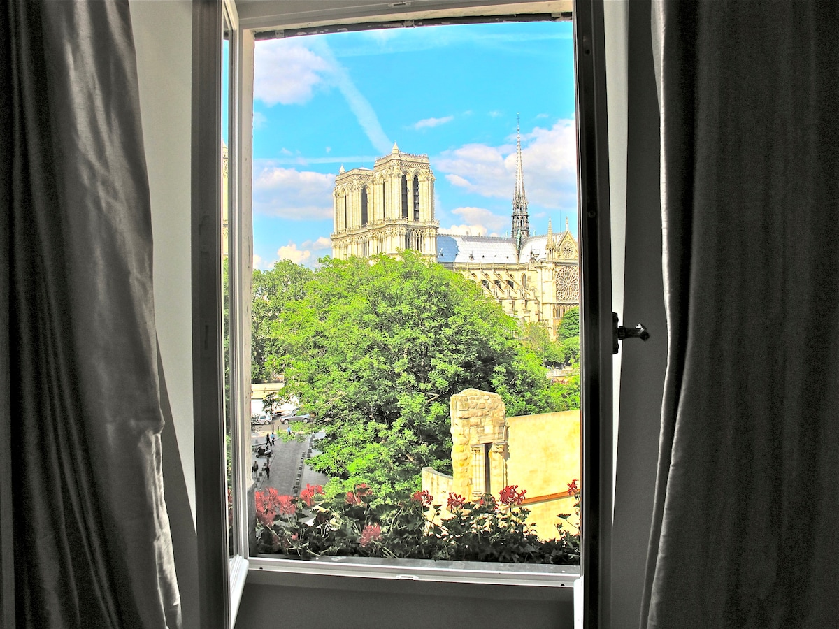 A beautiful and cosy apartment in the heart of Paris with an astonishing view of Notre Dame cathedral, the main square at Hotel de Ville, and the Eiffel Tower in the distance. Recently refurbished in 2014, this modern apartment contains a bedroom, fully-equipped kitchen, bathroom, a spacious living room and two small balconies.
