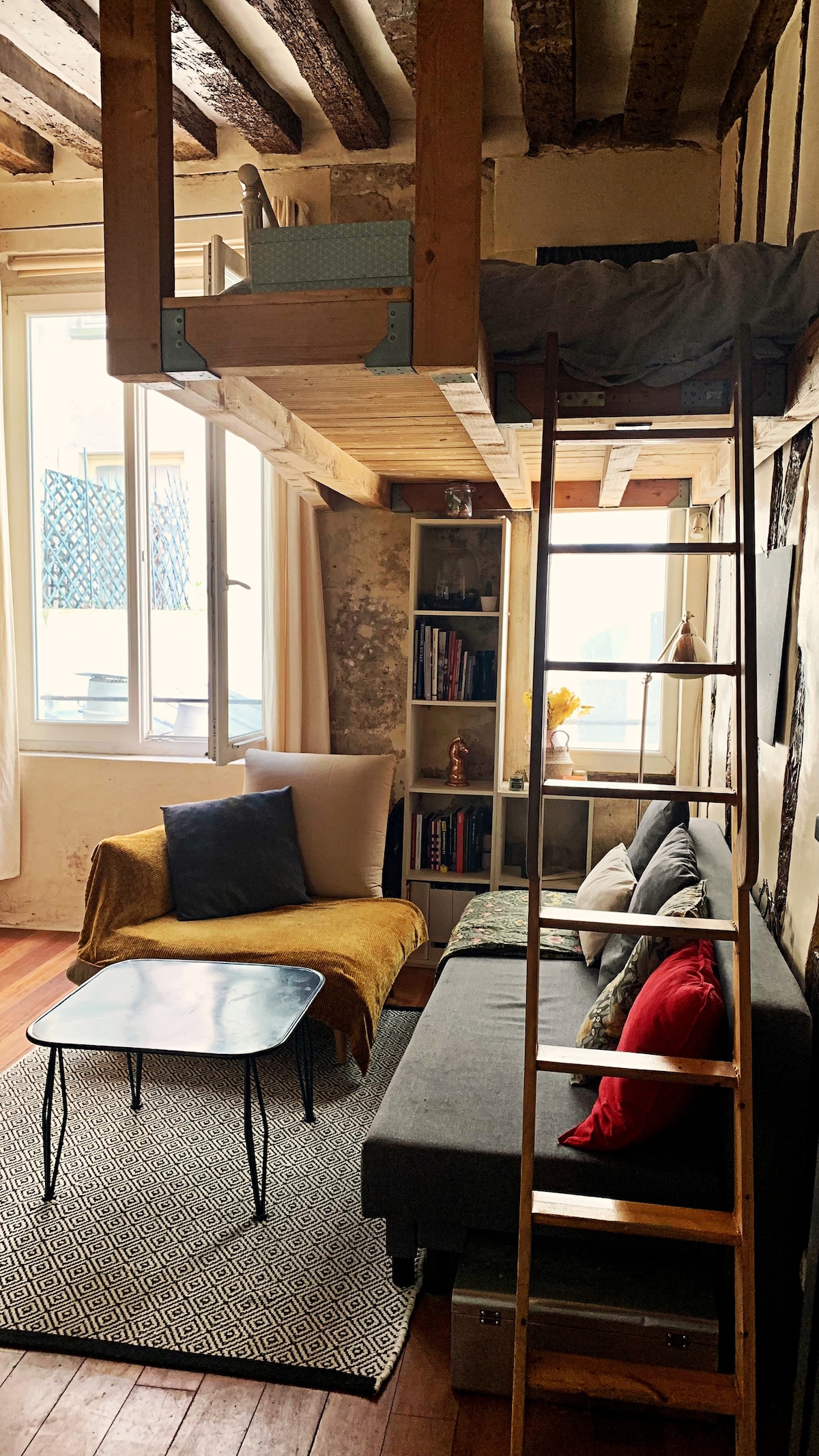 In a 17 century building in 5th Latin district, my apartment is a small Parisian studio ideal for 2 people (3 possible), with beamed ceilings, not alwayswith a very high ceiling... sometimes less than 190cm! It opens onto a quiet courtyard and not onto the street! Luxury in Paris! Everything you need to live like a Parisian: shops, restaurants, markets, bakery 😉