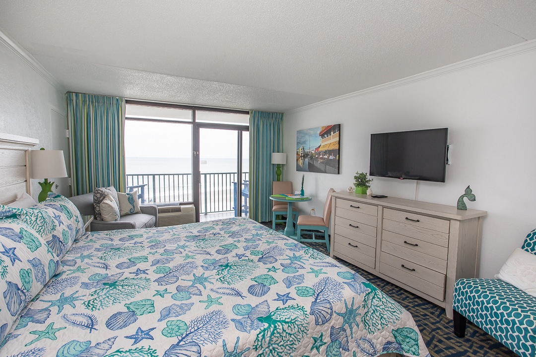 Located just a short block walk from the beach, come relax with a view of our refreshing seasonal outdoor pool in this king bed guestroom. Retro decor and modern amenities accent this comfortable room. Enjoy the convenience of having a microwave, mini-fridge, and coffee maker at your disposal, as well as USB charging ports, free WiFi, and a flat-screen TV too! We look forward to having you stay at the beach with us! **Please Note - Minimum age of 21 required to rent this unit.