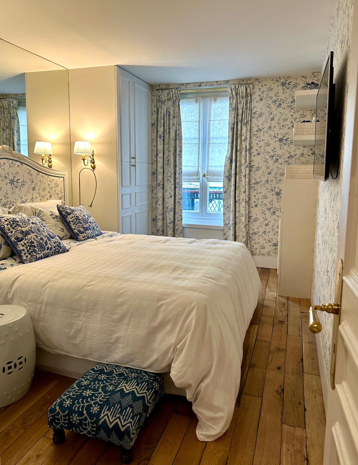 This spacious, 1 BR apartment is housed in a 17th century Latin Quarter building in one of the most desirable neighborhoods in Paris. Steps away from the Seine River, its romantic quais, historic cafes, shops, restaurants and monuments, it is quietly separated from the bustle by two picturesque courtyards. Close to so many sites that drew you to Paris. Its high wood beam ceilings and floor to ceiling windows give it a light, airy amazingly quiet place to relax.