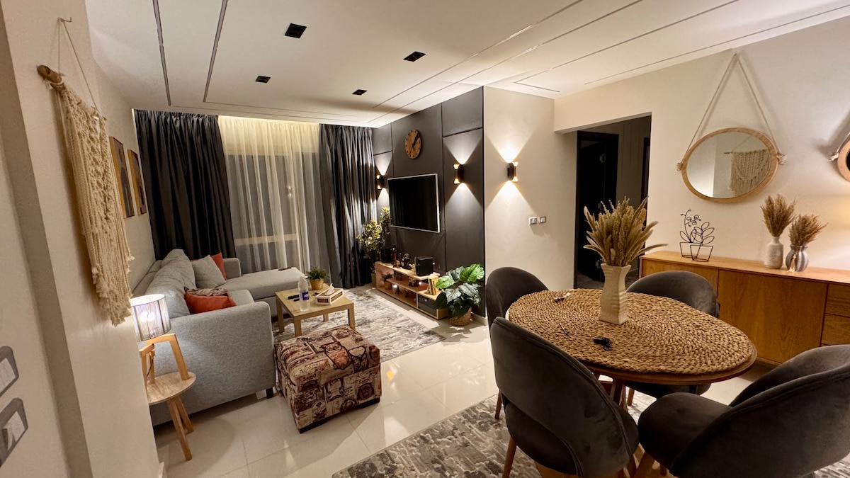 Welcome to our modern 3BR (320 sqm) hotel apartment by West Somid Developments! On the lower ground floor, it's perfect for families, groups & professionals. Enjoy 5G Wi-Fi, 5 smart TVs, electric shutters & new furniture. 24/7 security, guest lobby, food delivery & optional cleaning.. Guests can also enjoy a shared rooftop lounge — great for movie nights, relaxing evenings & family time. Just minutes from Mall of Arabia & top Zayed spots! ما نقدر نستضيف أي ثنائي عربي غير متزوج في نفس الشقة.