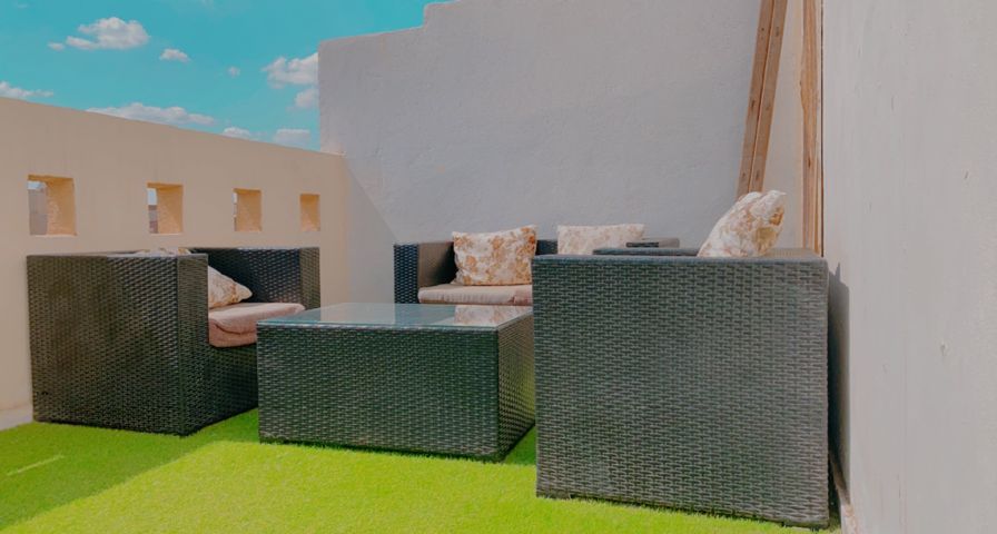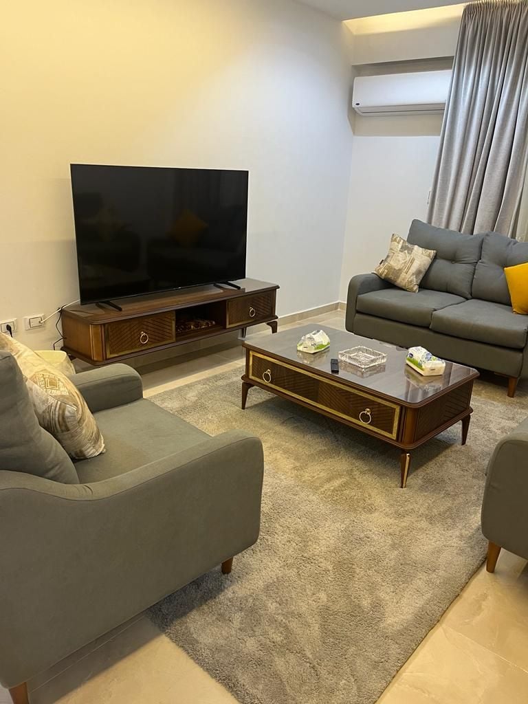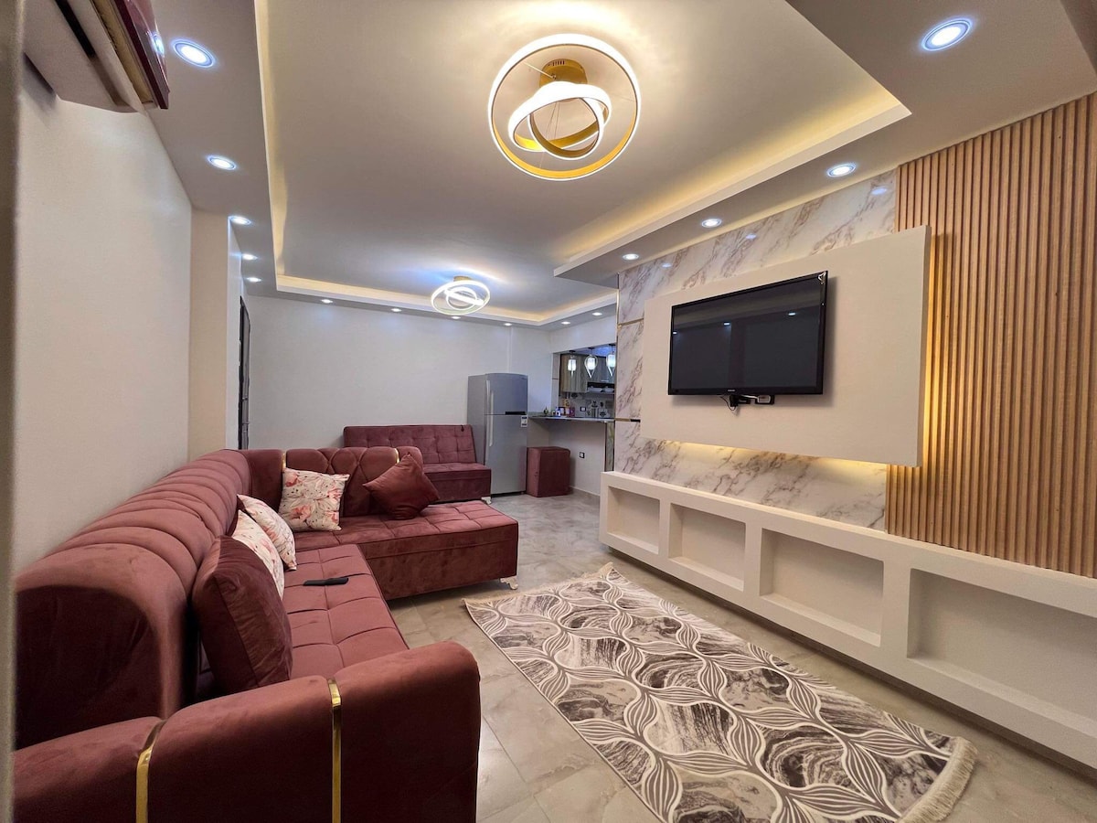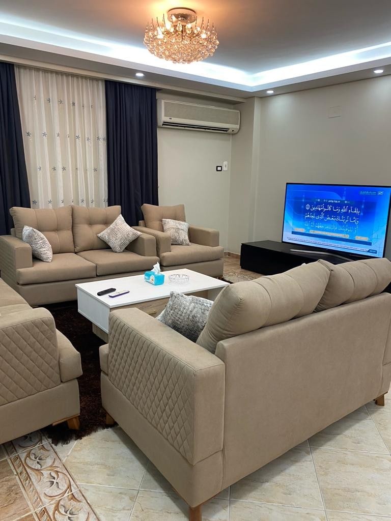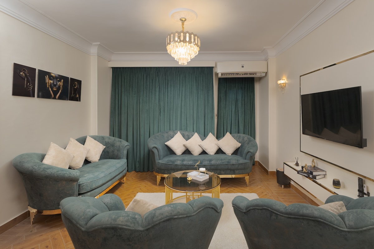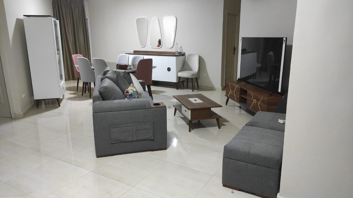 Enjoy a Sunny and Cozy apartment in 6th Of October city, Cairo, in a perfect location, The apartment is well lit and well ventilated with a great large green rooftop. The apartment is newly renewed and furnitured with a very comfortable and classic furniture with super clean bathrooms and fully equipped kitchen.