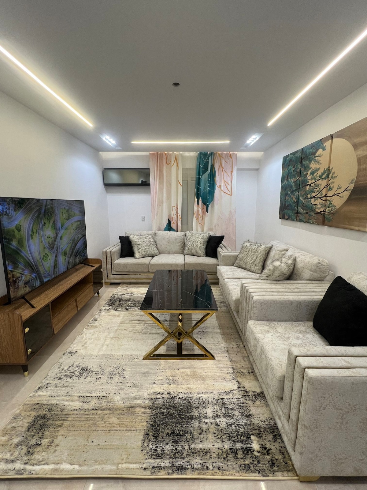 Welcome to our modern 3BR (320 sqm) apartment by West Somid Developments! On the lower ground floor, it's perfect for families, groups & professionals. Enjoy 5G Wi-Fi, 5 smart TVs, electric shutters & new furniture. 24/7 security, guest lobby, food delivery. Free weekly cleaning. Guests can also enjoy a shared rooftop lounge — great for movie nights, relaxing evenings & family time. Just minutes from Mall of Arabia & top Zayed spots! ما نقدر نستضيف أي ثنائي عربي غير متزوج في نفس الشقة.