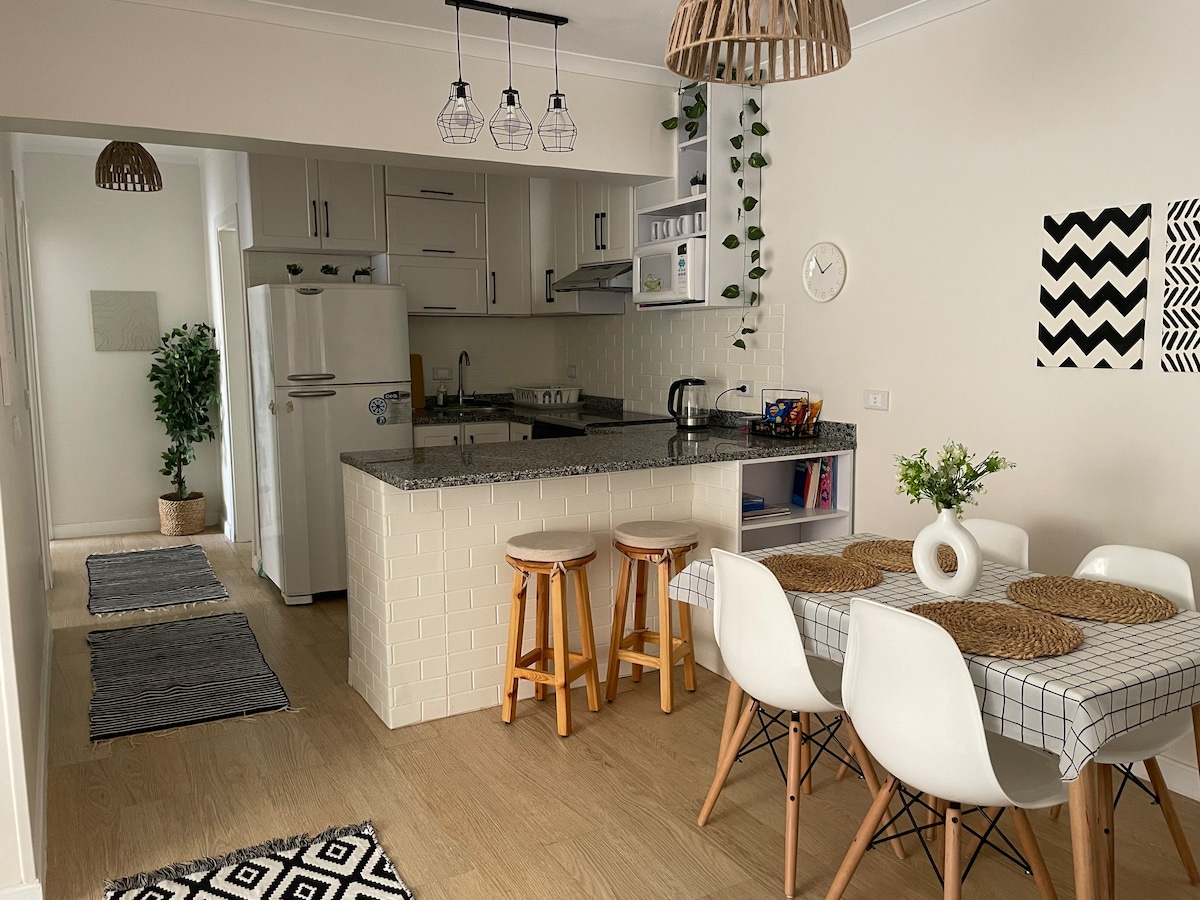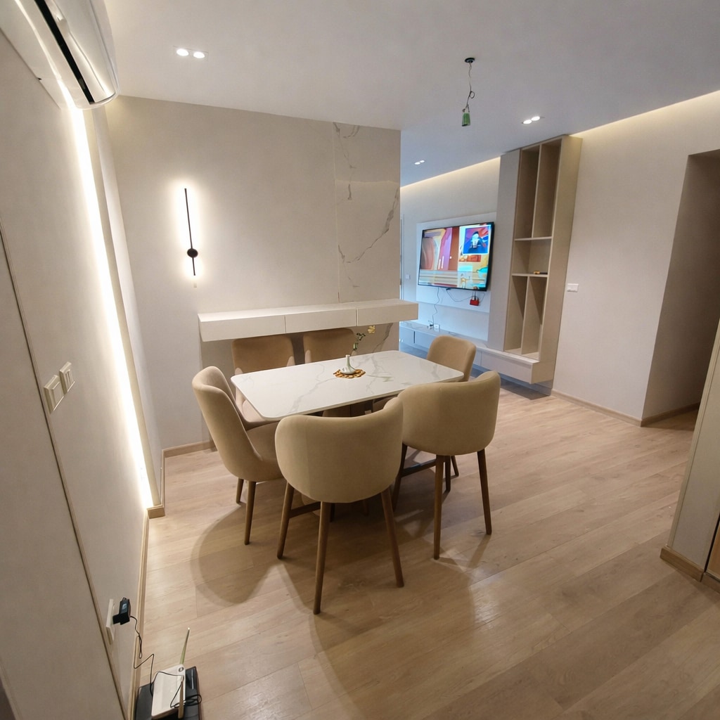Stay in our stylish 3-bedroom apartment (110 sqm) designed in a soft industrial style. Features 1 queen bed, 4 single beds, a spacious living area with sofa, armchairs, coffee tables & a swing. Enjoy a fully equipped kitchen (fridge, stove, washer, filtered water), dining table for 6, and a modern bathroom with shower & hair dryer. Relax with a 55" Smart TV & free WiFi. Includes free parking. Perfect for families & groups seeking comfort and design.