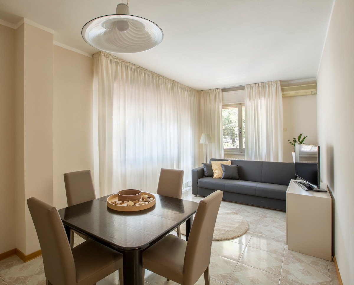 3 MINUTES TO BEACH. Third floor, no elevetor, tastefully decorated two bedroom apartment with free wi-fi. Quiet garden view on top floor is ideal for families with children, couples, work travelers or anyone seeking privacy. Located in the best part of Rimini, the elegant Central Marina area is surrounded by the best hotels of the Riviera, close to major tourist attractions and just steps to the beach. Courtyard parking available as well as ground floor storage area. Use of 2 free bikes.