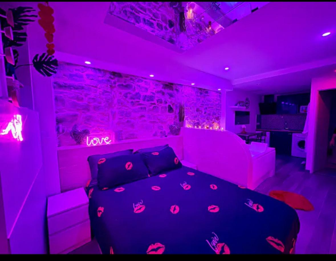 Découvrez un lieu atypique et intimiste, pensé comme une véritable parenthèse à deux. Nichée dans un cadre unique, cette love room sans fenêtre a été conçue pour offrir une atmosphère cocooning, propice à la déconnexion et à l’intimité. Profitez d’un jacuzzi privatif pour un moment de détente absolue, dans un espace au charme singulier avec ses pierres apparentes. Celles-ci peuvent dégager une légère odeur minérale naturelle, qui participe à l’authenticité du lieu et à son caractère unique.