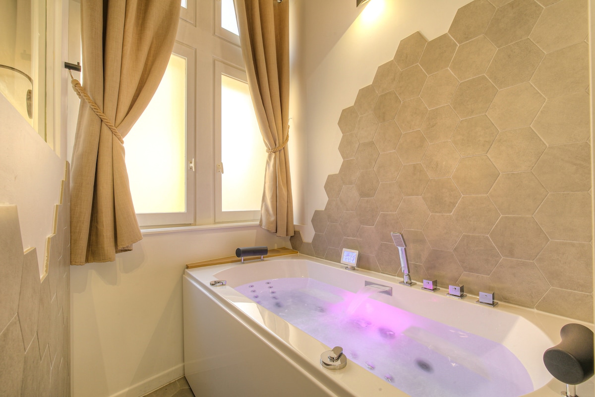 Step into a traboule, the typical Lyon building. No elevator here, each staircase is a walk through history, surrounded by the restaurants and bars of the lively city center. Inside, the atmosphere shifts completely: tropical vibes with exotic palms and warm colors. The centerpiece? A LED-lit jacuzzi bathtub, perfect for unwinding after a day exploring downtown Lyon. A truly unique stay for travelers who want to enjoy a journey within the journey.