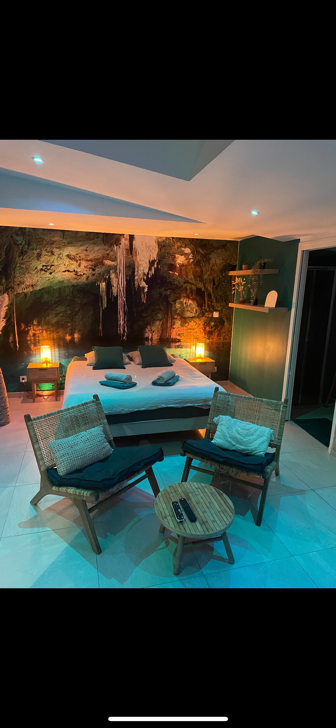 Située au coeur de la pinède, notre Suite Love&Spicy vous offrira un cadre unique pour profiter de vos instants en toute intimité, au calme absolu. Venez profiter de son jacuzzi professionnel ainsi que de son véritable sauna traditionnel, des peignoirs sont à votre disposition gratuitement. Retrouvez sa literie d'exception King size, avec linge de lit fourni ainsi que sa grande douche à l'italienne. Le petit déjeuner avec viennoiseries, jus de fruits, yaourt, confitures, fruits est inclus.