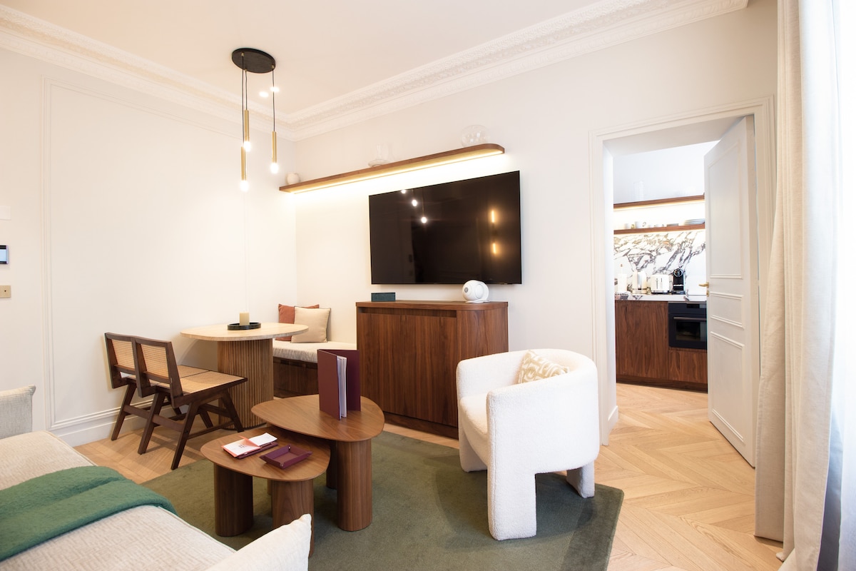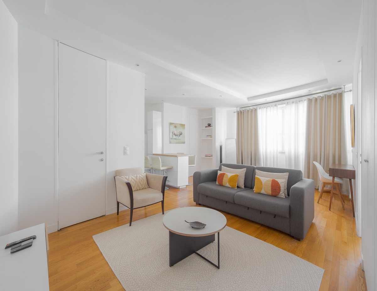 Overlooking our stunning inner courtyard and the charming neighboring church, your pied-à-terre offers open views, incredible natural light, and absolute tranquility—right in the heart of Paris. Each apartment includes a living room with a sofa bed, a dining area with a round table, a beautiful bedroom featuring a luxury hotel–quality bed, a fully equipped open kitchen with a dishwasher and washer-dryer, a shower room, and a separate toilet.