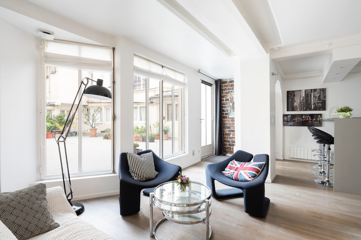 Boasting herringbone parquet flooring, fine furnishings and abundant natural light, this sophisticated 110m2 apartment offers a bright, elegant, warm and luxurious atmosphere. The apartment, with fireplace and moldings, combining charm, calm and comfort is located in one of the oldest passages in the historic center of Paris. This apartment has an official tourist accommodation operating license. So it's perfectly legal.