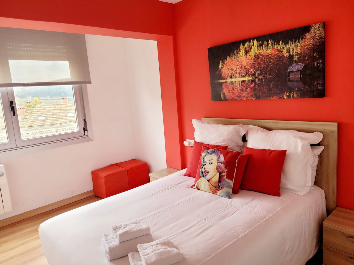 Luxury apartment with double bedroom, separate kitchen, living-dining room, bathroom with bathtub, balcony overlooking green area and covered garage space. Discover the charm of Santiago de Compostela and rest comfortably in our fully equipped apartment, located less than 15 minutes walk from the city center. The apartment has high-quality furniture and appliances and is located next to the bus and train station, in a quiet, green and central area.