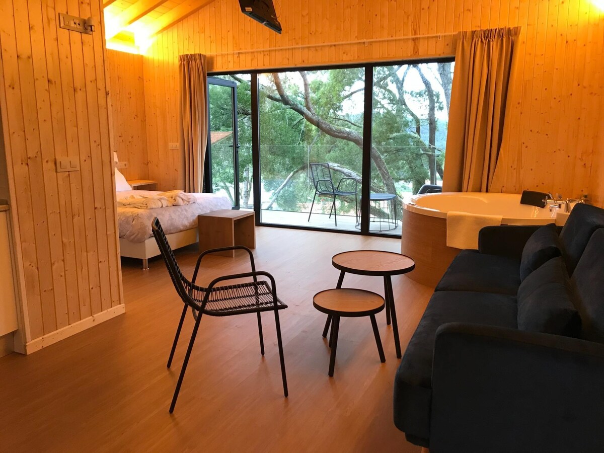 Cabaña recientemente reformada por completo con terraza privada, barbacoa, alumbrado exterior con diferentes ambientes, ducha exterior solar, zona de aparcamiento en la misma entrada, cocina completamente equipada. Con capacidad para hasta cuatro personas, dos camas individuales y sofa cama( según disponibilidad), aunque lo recomendable sería 2-3 huéspedes