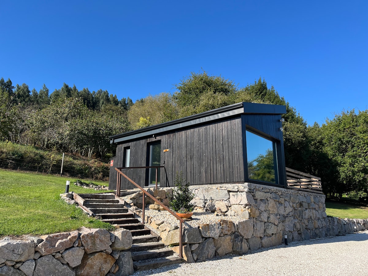 Cabañas En O Barqueiro a 5km de o Vicedo, 15Km de Viveiro y de Ortigueira. En A Mariña y en Ortegal. Unas escaleras te invitan a sumergirte en esta villa con vista panorámica de la ría y las montañas, Espacio diáfano (salón – cocina – habitación) con acceso directo al jacuzzi exterior cubierto con frontal abierto y baño independiente. Ven a disfrutar de gastronomía y festivales como Resurection Fest y Mundo Celta. Lugares de ensueño como Fuciño do Porco, Banco de Loiba, Estaca de Bares.