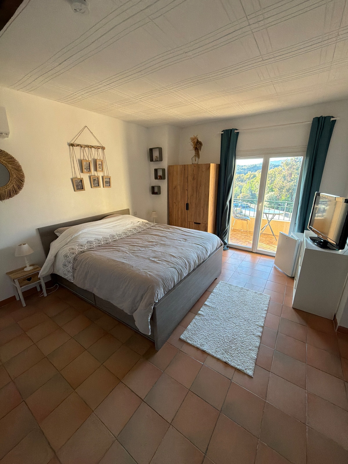 Notre logement offre une magnifique vue sur la montagne. Vous partagerez avec nous une piscine de 6X3M. La plage est accessible à pieds. Totalement rénové par nos soins, avec une décoration unique et raffinée. Vous disposez de 2 lits individuels dans la chambre et d’un divan lit 140X190 dans le séjour. La terrasse est équipée de fauteuils, table, chaises, barbecue. Isolés dans un immense jardin vous y serez au calme absolu. Vos enfants et animaux pourront y circuler en toute sécurité