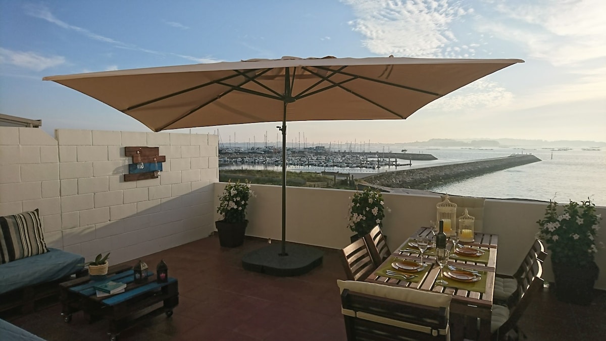 SEA, TERRACE, SEA Apartment in the urban area of Vilanova with large terrace above the sea and direct view of the marina. Access to small beach next to the door of the building and 100m beach of several km. Totally renovated and modern apartment with the necessary services and abundant tourist material, as well as a privileged starting point to get to know the Rías Baixas, Illa de Arousa, Sanxenxo, Pontevedra, Santiago de Compostela, Illas Atlánticas, Albariño wineries and much more.