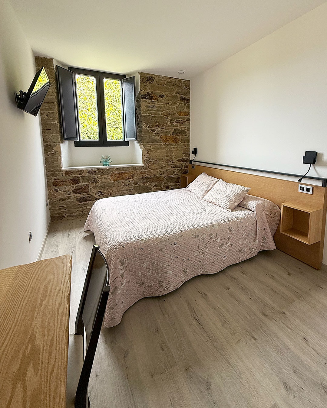 Habitación diseñada para dos personas. Ofrece comodidades y espacio adicionales, proporcionando una experiencia de alojamiento de alta gama. Cama grande de 135 cms. y comodidades modernas para una estancia confortable y relajante. Hotel rural situado en el verde campo de Galicia, a 10 km de la costa. Ofrece encanto y carácter y cuenta con una espaciosa terraza situada junto al río y con un bar-restaurante. La rústica decoración del hotel está en plena armonía con su emplazamiento..