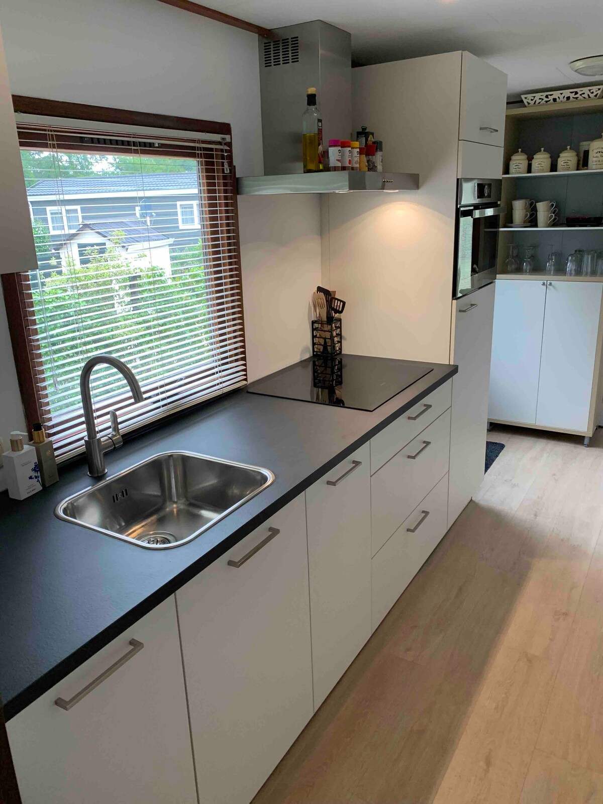 Luxe Tiny house met veranda met prachtig uitzicht op Drents landschap Hier lopen zomers grazende koeien en paarden en stroomt er de Hunze doorheen Het huisje heeft Een keuken met vaatwasser en inductie plaat een douche en toilet en tv Buiten een gezellig overdekt zitje met BBQ en met fenomenaal uitzicht over het natuurgebied