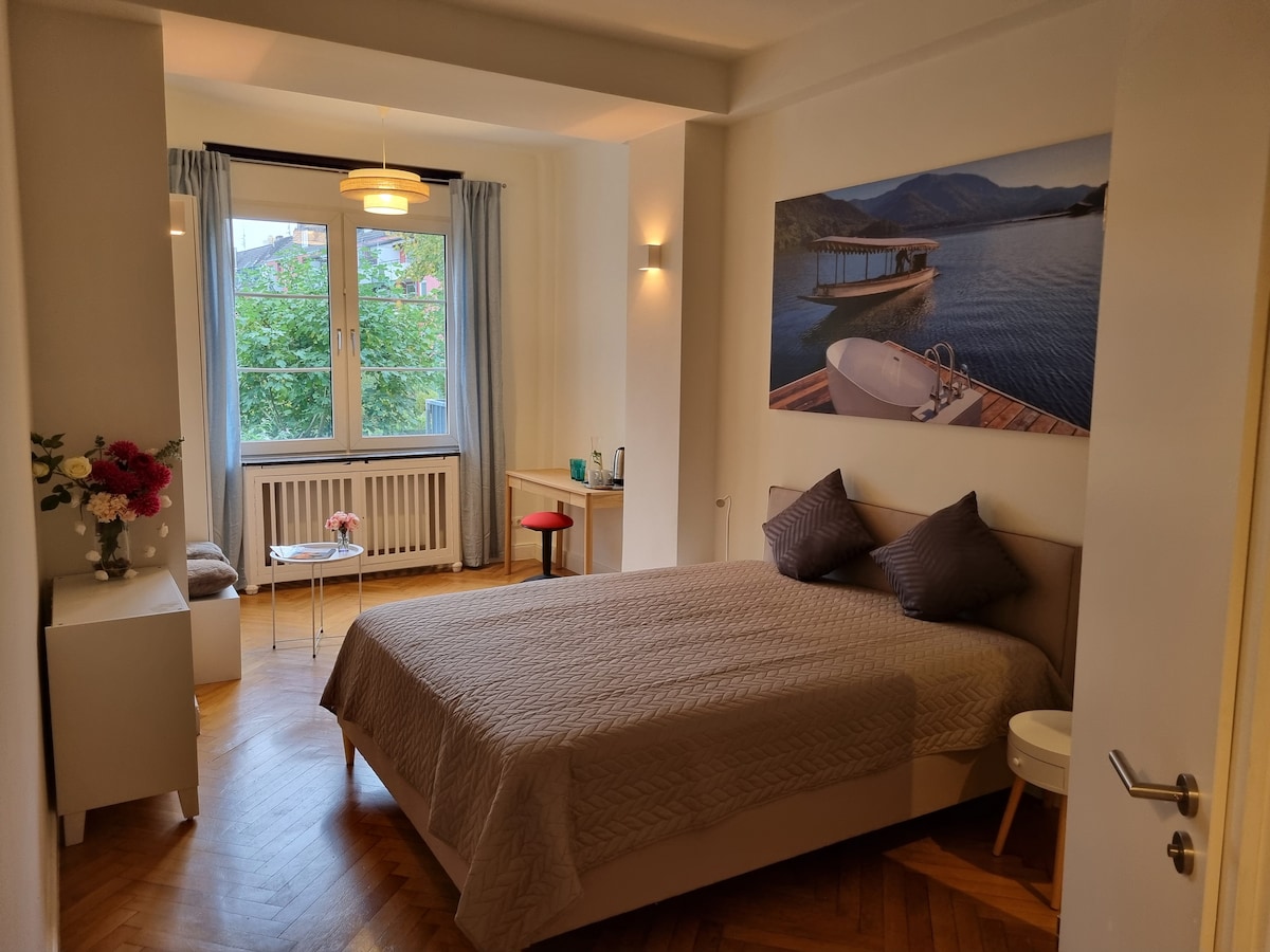 Bitte schreibe mir, falls dein Termin nicht verfügbar sein sollte. Dich erwarten 2 schöne Schlafräume mit jeweils 1 Doppelbett (160x200). Dazu 1 Schlafempore (140x200) und 1 sehr bequeme Schlafcouch (130x200) sowie eine große Schlafcouch (150x200) und das Doppelbett (160x200) im Gartenzimmer. Dazu eine moderne Küche, ein schickes Bad mit Fenstern und eine möblierte Terrasse. Private Gegenstände sind auf ein Minimum reduziert. 5 Min. Fußweg bis Eurogress oder Tivoli, 15 Min. zum Rathaus/Dom.