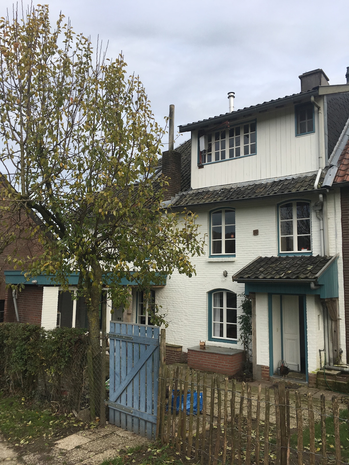 Vakwerkwoning met uniek uitzicht naast boerderij.