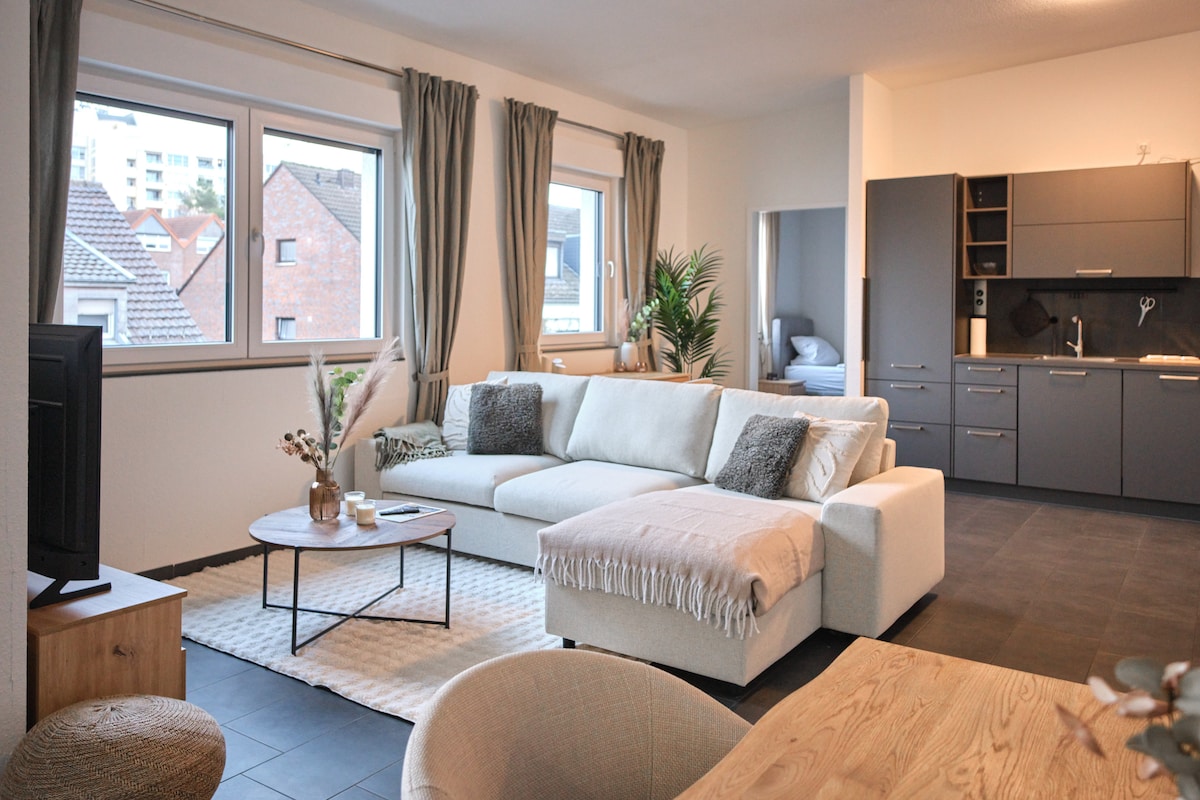 Unsere moderne Zweitwohnung befindet sich im Zentrum von Aachen in direkter Nähe zum Rathaus. In 2 Gehminuten erreicht man das Aachener Studentenviertel mit vielen günstigen Restaurants, Bars und einem Supermarkt. Bei einer Mietdauer von mehr als 90 Tagen unterbreiten wir gerne ein individuelles Angebot. Die Wohnung ist ruhig gelegen, 44 qm groß und befindet sich zur alleinigen Nutzung in der 3. Etage. Das Schlafzimmer hat ein 1,80x2,00m Boxspringbett und das Bad ist frisch renoviert.