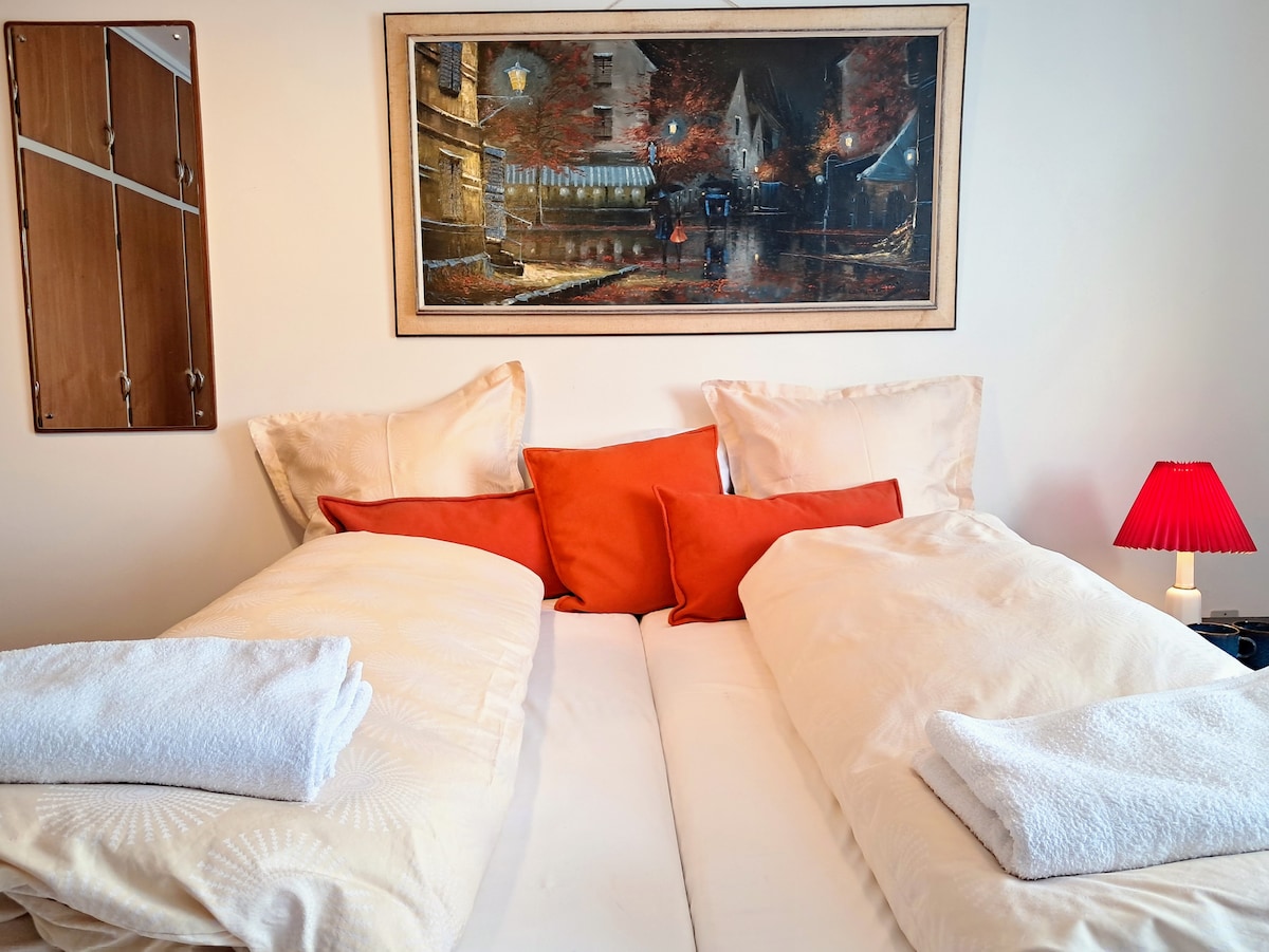 Privat afdeling af villa med separat indgang i rolige Gl. Kilden lige uden for Frederikshavn – kun 9 min. fra færgen i bil. Ideel til familier og venner: to soveværelser med to kvalitetssenge i hvert værelse samt stue med sovesofa. Eget badeværelse med badekar og bidet samt fuldt udstyret køkken med: induktionskomfur, mikroovn, kaffemaskine, køleskab og fryser. Gåafstand til Vandværksskoven og Bangsbo. Stor naturhave med bålsted under bøgetræ, egen terrasse, gratis parkering og hurtigt Wi-Fi.