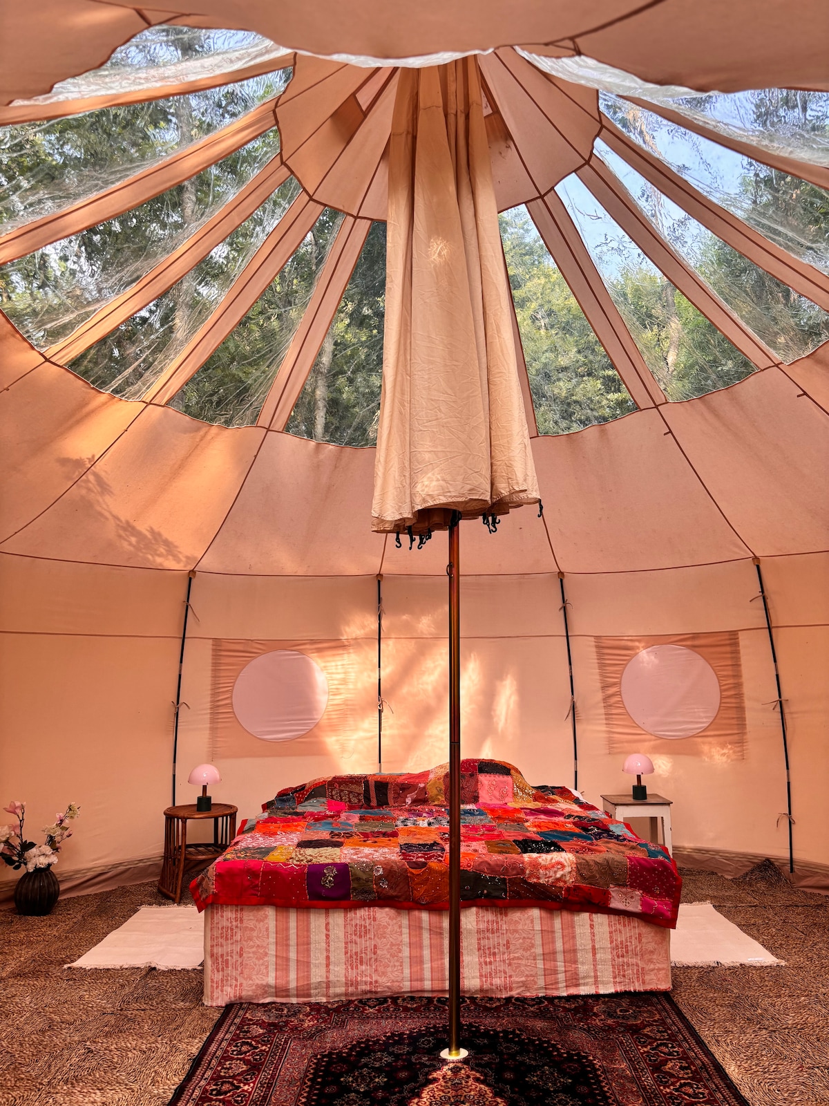 Her kommer du tæt på naturen. Nyd udsigten fra dette 28 m2 luksus-glampingtelt, med en stor opredt seng, dyner fra Fossflakes, træterrasse, eget das midt i skoven, udebrus og en fuldkommen unik, fredfyldt stemning. Teltet ligger i privat skov, så du er uforstyrret. Om aftenen kan du tænde lanternerne eller tage et stjernekig gennem den gennemsigtige top i teltet. Du kan lave mad på en gasgrill eller trangia. Der er gryde/pande/kaffebrygger til rådighed.