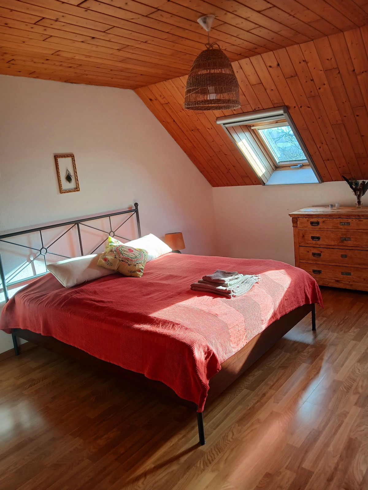 Die Unterkuft befindet sich in einem idyllischen Dorf, auf einem zentral gelegenen BIO Bauernhof. Der Hof befindet sich auf beliebten Velorouten. Gerne darfst du unsere Tiere und den Garten begrüssen,geniessen. Auf Wunsch bereite ich auch gerne, ein Bio Frühstück oder Abendessen für sie zu. Muss vorbestellt werden. Preis pro Person: Frühstück 14.- Abendessen 18.- Die Unterkunft befindet sich im 2.Stock, besteht aus einem grossen Schlafzimmer mit seperatem Badezimmer und einer kleinen Essecke.