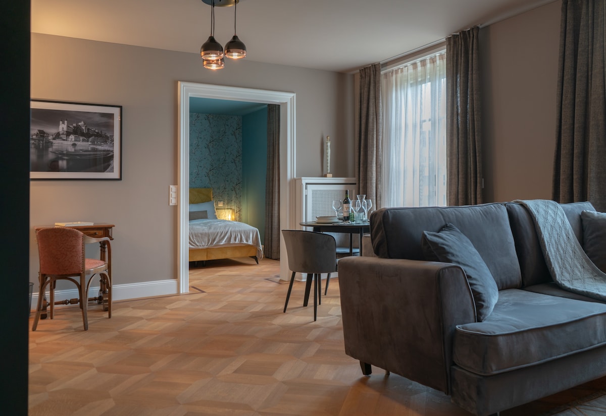 Stay at Hirschen Erlinsbach, a cozy family-run retreat at the gateway to Jurapark Aargau. The 2-room Family Winemaker’s Apartment (36 m²) features a double bed, two single beds, two TVs, a safe, a desk, Wi-Fi, and a small kitchen with coffee maker and kettle. Inspired by Swiss winemakers, the décor reflects the region’s rich wine and culinary traditions. Non-smoking.