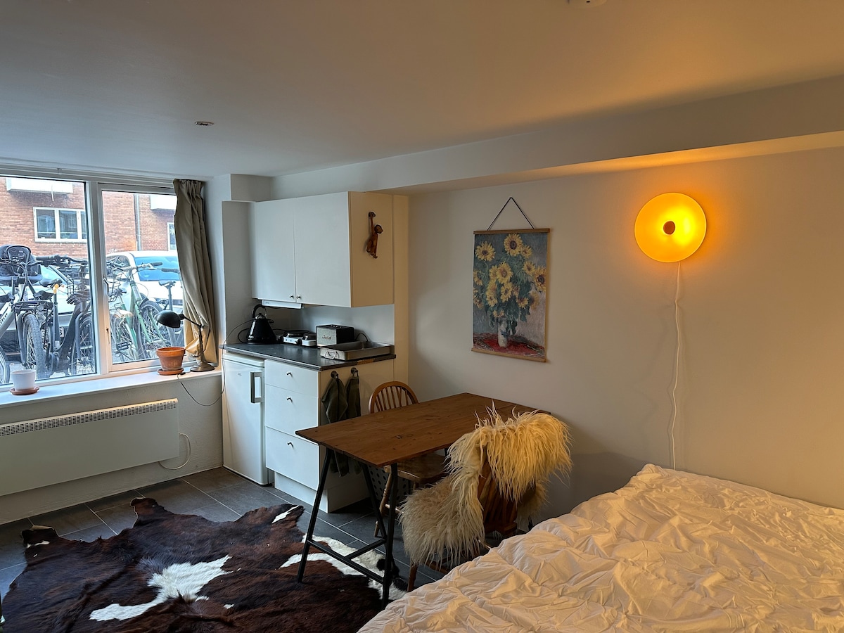 Ombygget atelier med masser af lys og luft. Lejligheden er indrettet som ét stort rum over 2 plan, dog er badeværelset separat. Beliggende på rolig villavej i Aarhus C. Tilkøb af parkeringsplads kan bestilles. Nabo til Universitetet, Handelshøjskolen, Den Gamle By og Botanisk Have. Her er alt, hvad I har brug for til et kort eller langt ophold. I gåafstand til det meste. Let at komme til med offentlig transport. Udgang til egen terrasse. Egner sig ikke til børn, da boligen ikke er børnesikret.