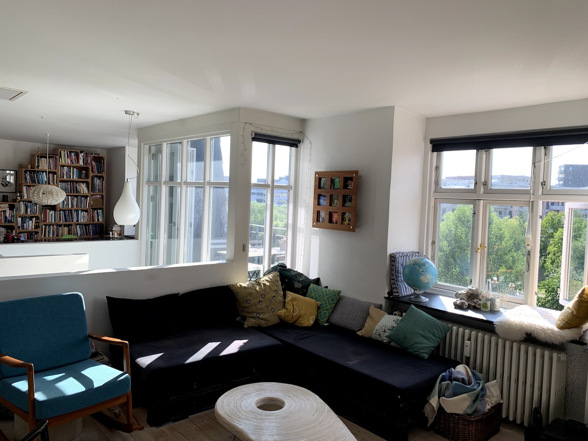 Our lovely home in the center of Aarhus is located at the top of the property. The entrance starts on 3rd floor and leads up to the living room. The staircase divides it with sofa and dining area with access to the balcony. 3 rooms – double bed in one, 160 cm in another and single bed in the third. One can lie on a mattress on the floor or on the sofa. Large kitchen and bathroom with shower and tiled floors with heating. There is everything you need for a nice holiday or weekend.