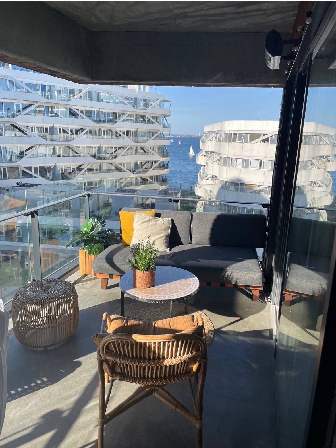 Denne smukke og indbydende lejlighed på 85 m2 med 2 altaner ligger i første række på Aarhus Ø, ved det internationale sejlsportscenter. Du får den skønneste udsigt over vandet/indsejlingen til lystbådehavnen, tæt på Aarhus C og skoven. Hyggeligt indrettet med designermøbler og kunst på væggene. Nyd din formiddag i solen på den lille altan og et glas vin om eftermiddagen / aftensolen på den store udsigtsaltan.