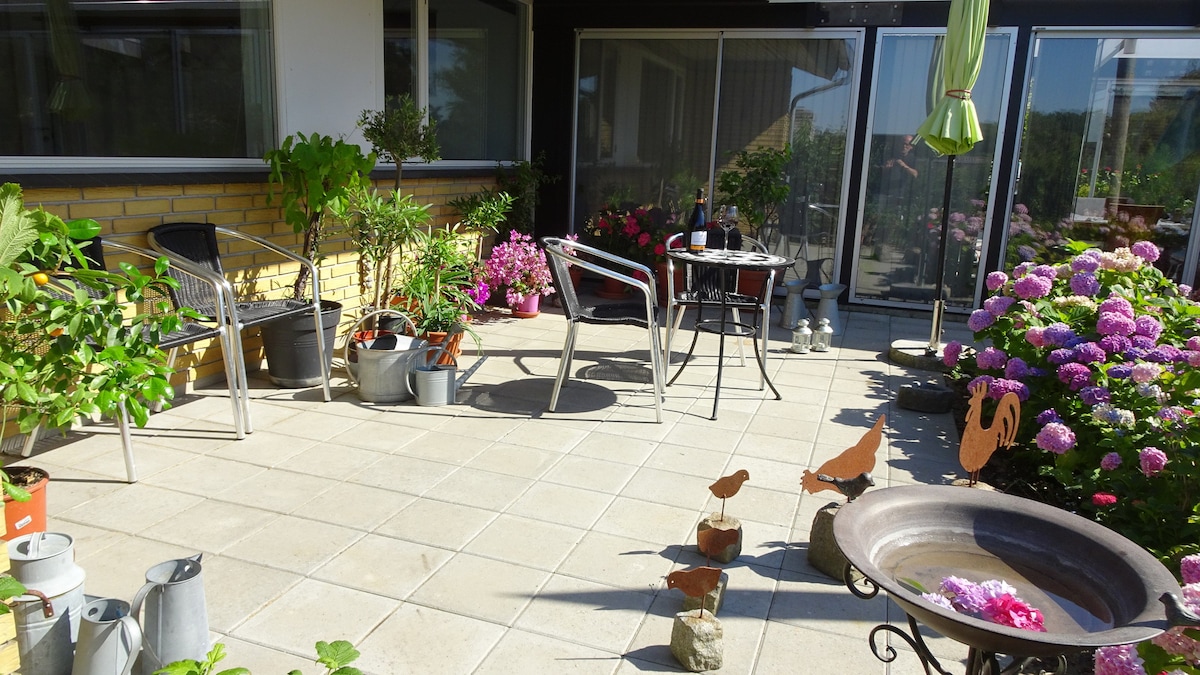 The guest suite is separated from the rest of the house. We live next door - just ring the bell if we can help you. The guest suite is exclusively being used for Airbnb. The large room has one large bed with room for 2 (3) people, kitchenette with basic spices and kitchen equipment, one cooktop, fridge, microwave oven, as well as a dining table and couch. The smaller room has two single beds. There's free wifi (300Mb) in both rooms. Also free Netflix There's a large bathroom with toilet, changing table, baby tub, shower, and underfloor heating. We supply bed linen and towels There are two private terraces. One facing west and one with a beautiful view facing east. Here you can enjoy your morning coffee or your evening dinner. You can cook yourself in the kitchenette or order pizzas from our local pizza bakery (300 meters away). There's only 400 meters to several grocery stores. 2 playgrounds within 200 meters