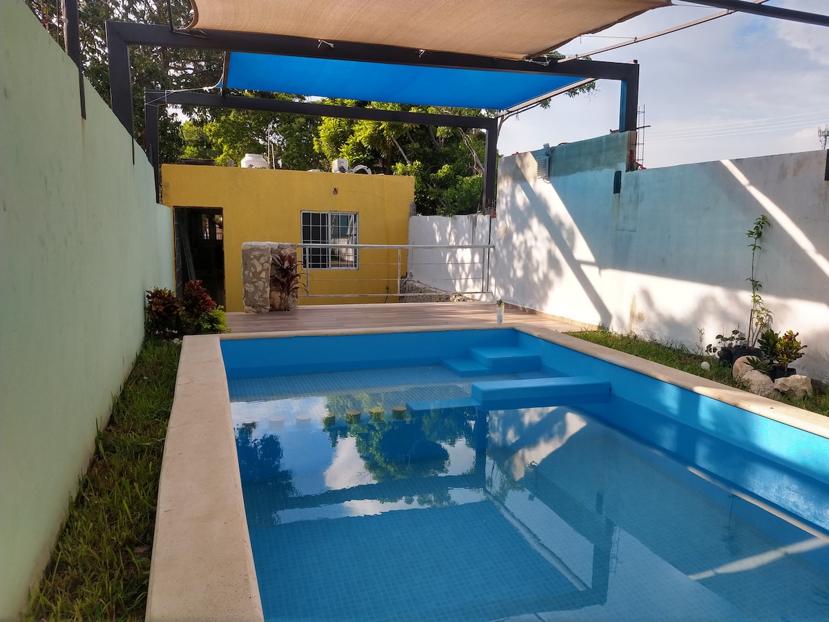 Hermosa casa cómoda, acogedora de colores frescos, el centro está a 15 minutos en auto, ,cerca del hospital de IMSS C-42, corredores gastronómicos, ideal para descanso corto y prolongado, cuenta con wifi, estacionamiento ,sala comedor cocina y dos recamaras con aire acondicionado y opción para colgar hamacas, hermoso jardín unido a la terraza y a la piscina. Completamente privado, transporte cercano a 1 esquina y a 5 minutos del supermercado.