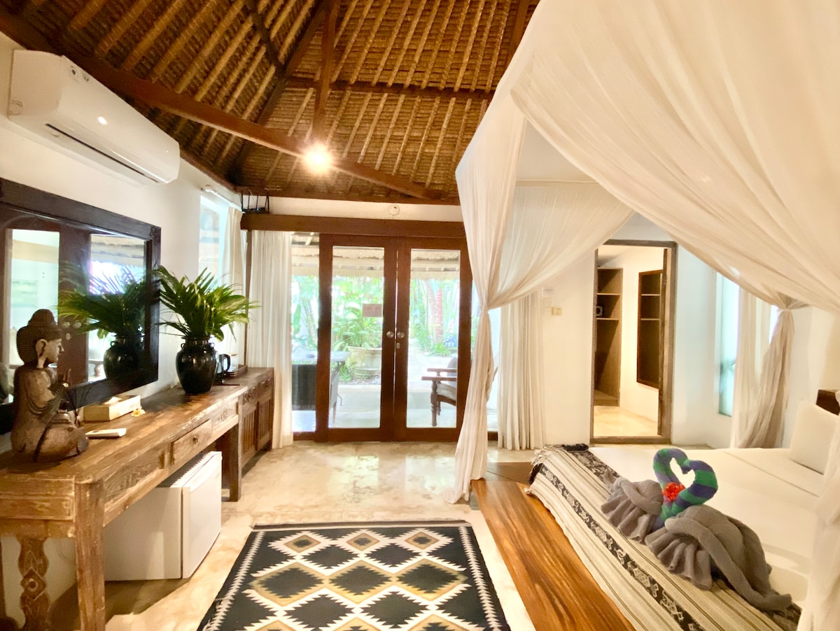 Discover many surprising ways to unwind in this self-contained Villa Bungalow within our sprawling estate. Wander lush gardens, sway in a vintage-style tandem swing, or relax by the natural stone pool. Soak in a designer tub or choose a book that tickles your fancy and relax on the breezy patio/veranda daybed. Your King Bed is like sleeping on a cloud. Also included: - Separate kitchen - Daily maid/housekeeping service - Up to 150mbps Wifi - 8-10 min walk to the beach - Peaceful, quiet